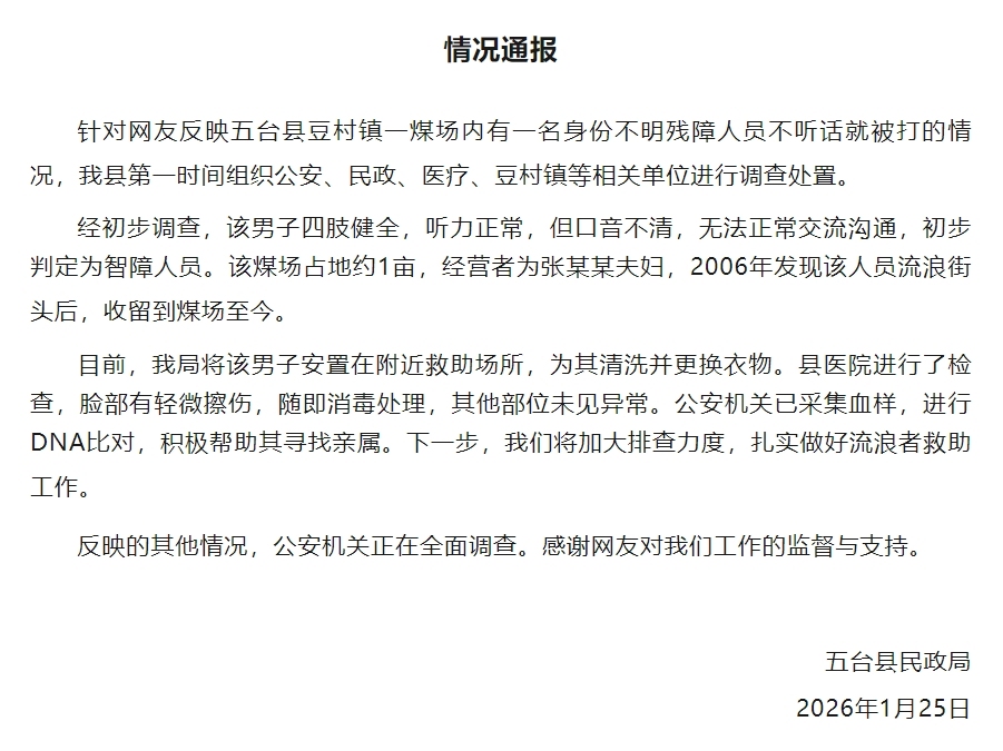 1月25日晚,山西五台县民政局发布情况通报称,针对网友反应五台县豆村镇一煤场内有又名身份不解颓势东谈主员不听话就被打的情况,该县第一技巧组织公安、民政、医疗、豆村镇等干系单元进行拜访惩办。