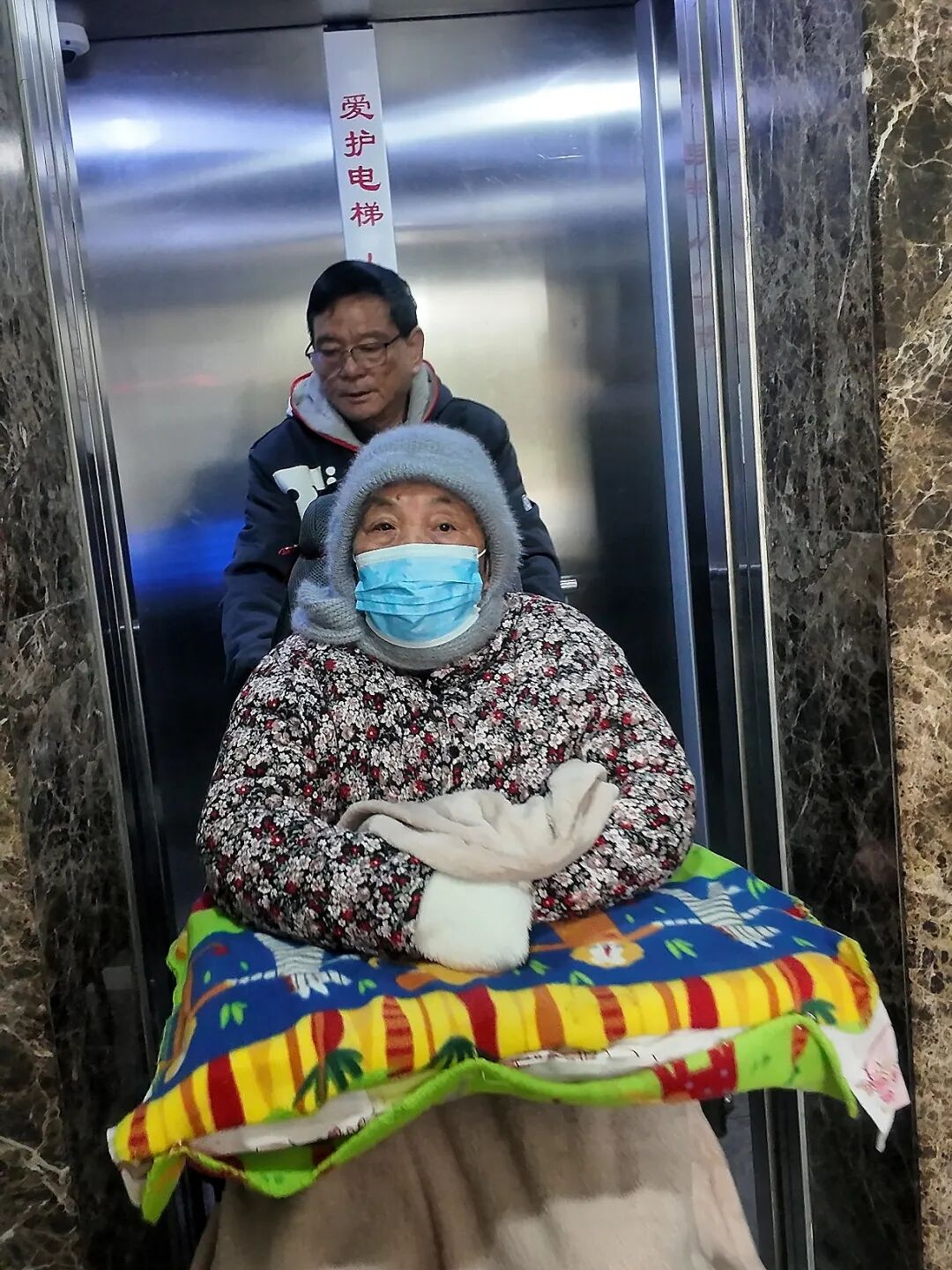 再劳作地将她搀扶到电动轮椅上