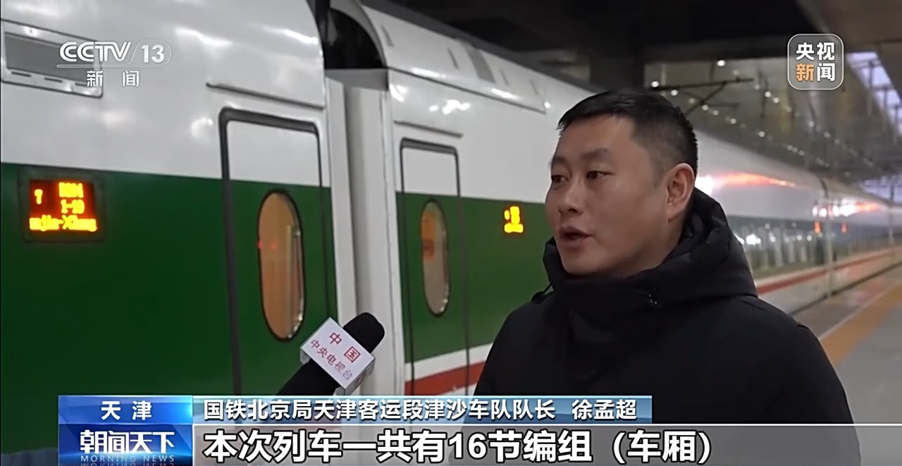 国铁北京局天津客运段津沙车队队长 徐孟超:本次列车一共有16节编组车厢,提供二等卧一共是10个车厢,一等卧是3个车厢,还有3节硬座车厢,知足通勤、旅行的需求。