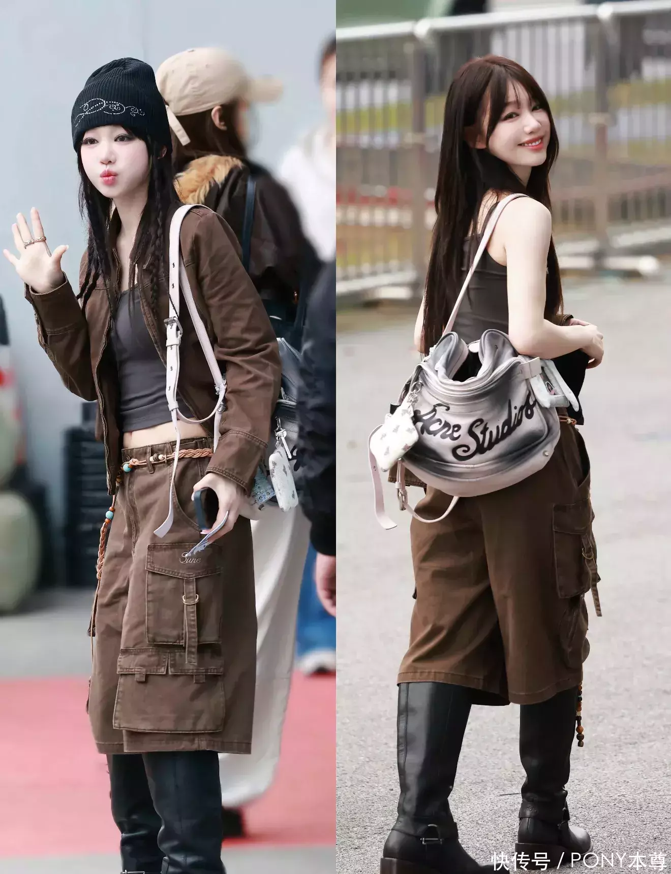 Look2:棕色短帽衫+工装七分裤!复旧穿搭也不错很甜,滚球app复旧棕色夹克内搭同色系吊带的造型也很出圈儿!内搭领受短款清醒纤细微蛮腰,下半身是7分裤,搭配长筒靴、又甜又酷!